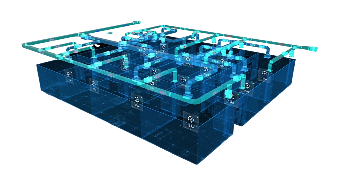 The digital twin modeling is carried out for the clean air system. In the modeling process, the actual equipment on site is matched with the model in the platform database to digitally restore the wind system, and the optimization calculation is carried out based on the high-precision model to realize the energy saving and optimal control of the system.